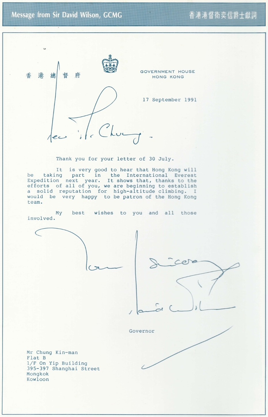 wongsee9,鍾建民和湛易佳是在1992年5月12日登上珠穆朗瑪峰,當時彭督還未來香港接任呢;應承做兩位頭家的贊助人是衛督。